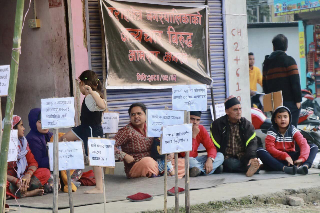 नगरपालिकाले केही साता अघि लिएको सडकको नापमा स्थान र ब्यक्ति हेरेर ६५ फिटदेखि ७२ फिटसम्म असमान नापजाँच गरिएपछि त्यसका विरुद्ध अनसन बस्नु परेको अनसनरत रिना खड्काले बताइन् ।