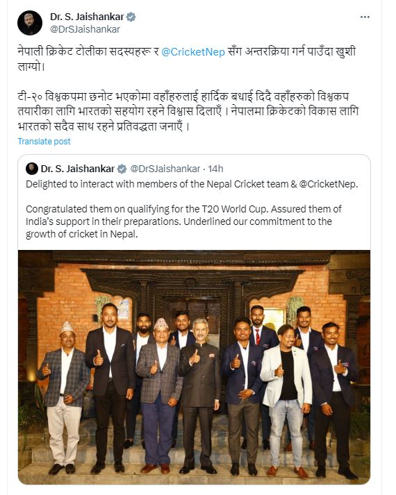 जयशंकरले एक्स पूर्व ट्विटरमा ट्विट गर्दै नेपालमा क्रिकेटको विकासको लागि पनि सहयोग गर्ने उल्लेख गरेका छन् । नेपाली भाषामै उनले लेखेका छन्, नेपाली क्रिकेट टोलीका सदस्यहरू र क्रिकेट नेपालसँग अन्तरक्रिया गर्न पाउँदा खुशी लाग्यो।