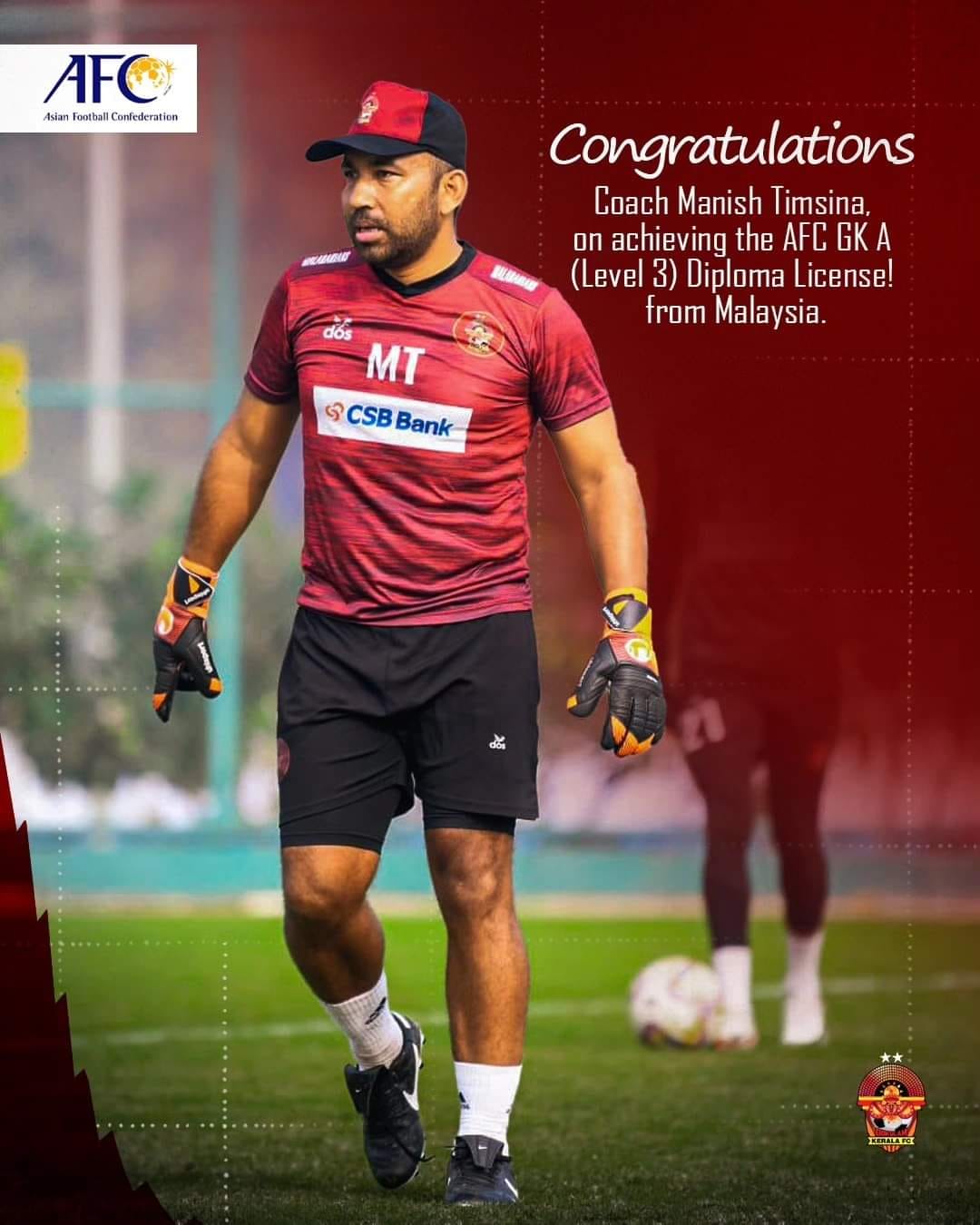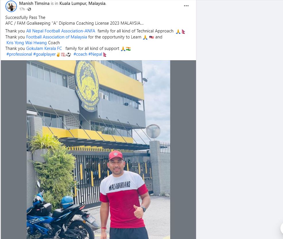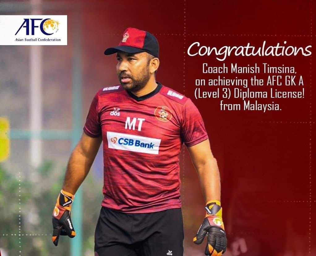 नेपालका फुटबल गोलकिपर प्रशिक्षक मनिष तिम्सिना एएफसी गोलकिपिङ ‘ए’ डिप्लोमा लाइसेन्स प्राप्त गर्ने पहिलो नेपाली बनेका छन् । मनिषले मलेसियन फुटबल संघ (एफएएम) ले आयोजना गरेको कोर्समार्फत गोलिकपिङ ए लाइसेन्स प्राप्त गरेका हुन् ।