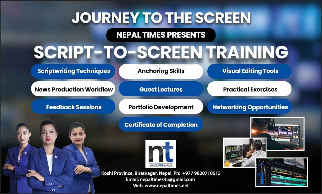नेपाल टाइम्सले मिडियासम्बन्धि एक महिने तालिम सुरु गरेको छ । ‘जर्नी–टू–दि–स्क्रीन’को अभियानका रुपमा नेपाल टाइम्सले “स्क्रीप्ट–टू–स्क्रीन” एक महिने तालिम मंगलबारबाट सुरु गरेको हो ।