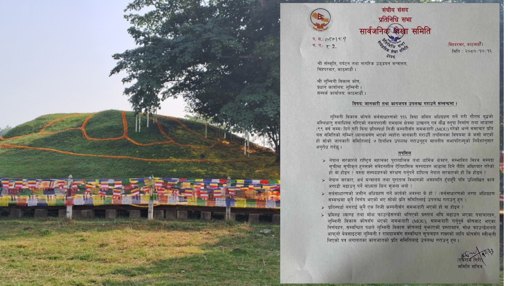 गौतमबुद्धको अस्थिधातु समाधिस्थ गरिएको नवलपरासी रामग्राम क्षेत्रमा उत्खनन् एवं बौद्ध स्तुपा निर्माण तथा भाडामा दिने गरी विना प्रतिस्पर्धा निजी कम्पनीसँग समझदारी भनी सञ्चार माध्यममा समाचार प्रकाशित भएपछि लेखा समितिले चासो देखाएको हो । ‘‘के कसो भएको हो सोको जानकारी समितिलाई सात दिनभित्र उपलब्ध गराउनुहुन माननीय सभापतिज्यूको निर्देशानुसार अनुरोध गर्दछु’ मन्त्रालय र लुम्बिनी विकास कोषलाई लेखिएको पत्रमा भनिएको छ । लेखा समितिले मन्त्रालय र कोषसँग पाँच वटा विषयमा जानकारी मागेको छ ।