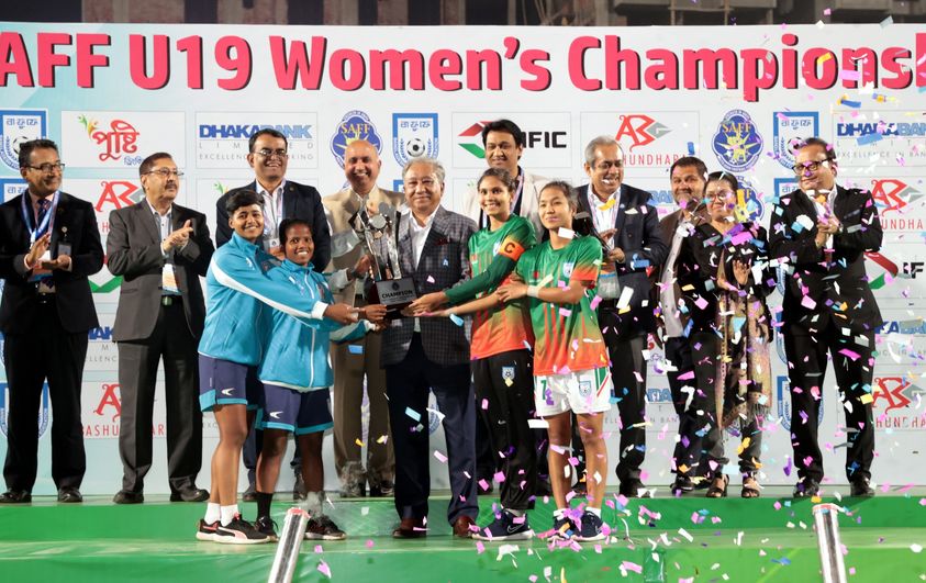 घरेलु टिम बंगलादेशले रेफ्रीबाट भएको टसको निर्णय नमानेपछि साफ यू–१९ महिला च्याम्पियनसिपको उपाधि बाँडिएको छ । बिहीबार बंगलादेशको ढाकामा भएको फाइनलमा घरेलु टिम र भारतले खेलको निर्धारित समयमा १–१ को बराबरी खेलेका थिए । यसपछि खेल पेनाल्टीमा पुगे पनि टाइब्रेकरमा ११–११ को बराबरी भएको थियो ।