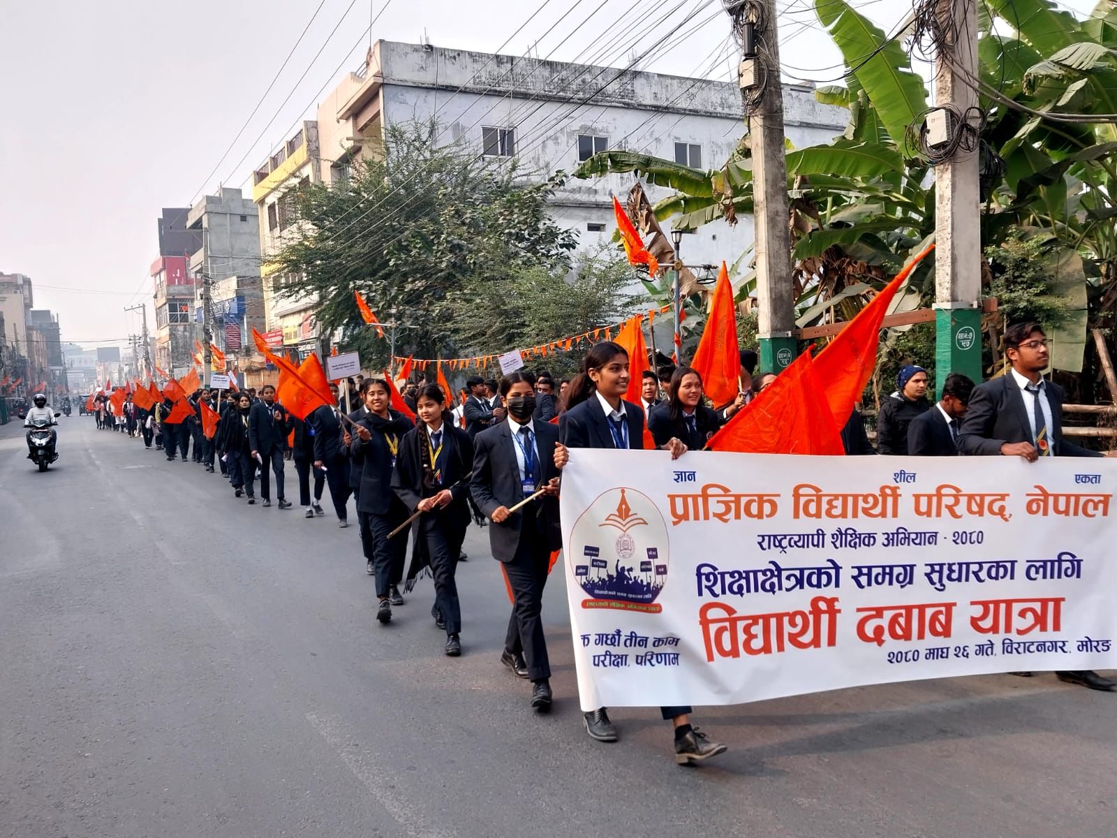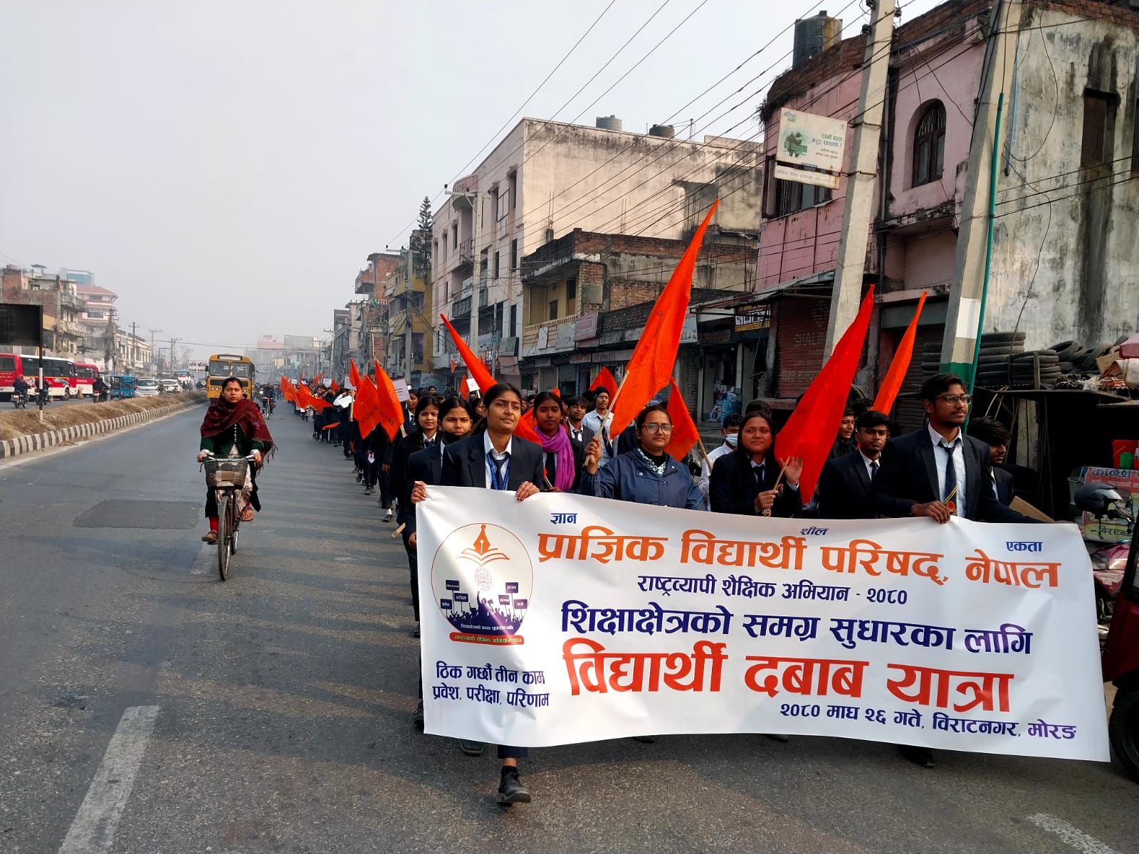 प्राज्ञिक विद्यार्थी परिषद् नेपालले शुक्रबार विराटनगरमा शिक्षाक्षेत्रको समग्र सुधारका लागि विद्यार्थी दबाब यात्राको आयोजना गरेको छ । प्राज्ञिक विद्यार्थी परिषद् नेपाल सगरमाथा एवम् जानकी प्रदेश संगठन सचिव एवम् केन्द्रीय विश्वविद्यालय कार्य प्रमुख छितराज न्यौपाने लगायतको सहभागितामा परिषद्ले राष्ट्रव्यापी शैक्षिक अभियान २०८० अन्तर्गत शिक्षाक्षेत्रको समग्र सुधारका लागि विद्यार्थी दबाब यात्राको आयोजना गरिएको हो ।