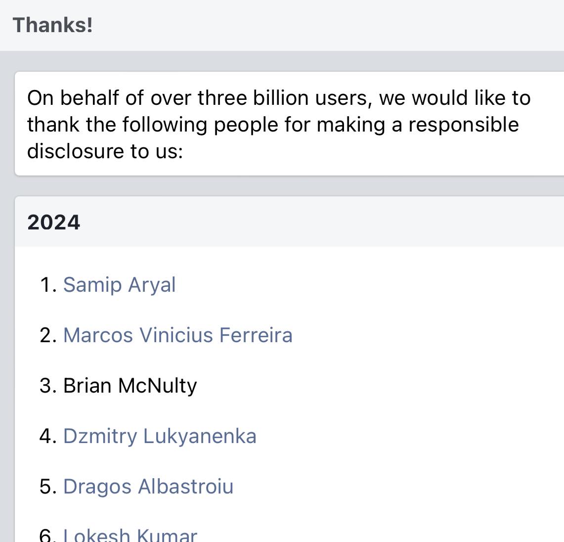 शुक्रबार मेटाले आफूलाई ह्वाइट ह्याक अर्थात हल अफ फेमको पहिलो ¥याङ्कमा राखेको साइबर सुरक्षा विज्ञ समीप अर्यालले बताएका छन् । उनले भनेका छन्,‘फेसबुकमा भएको जुनसुकै एकाउन्ट एक क्लिक र जिरो क्लिकमै आफ्नो कब्जामा लिन सक्ने कमजोरी पत्ता लगाएँ । यस्तो एकाउन्ट नै टेकओभर गर्ने कमजोरी पत्ता लगाएर फेसबुकमा नोटिस गरेपछि मेटाले सन् २०२४मा एक नम्बर ¥याङ्क दिएको हो।’