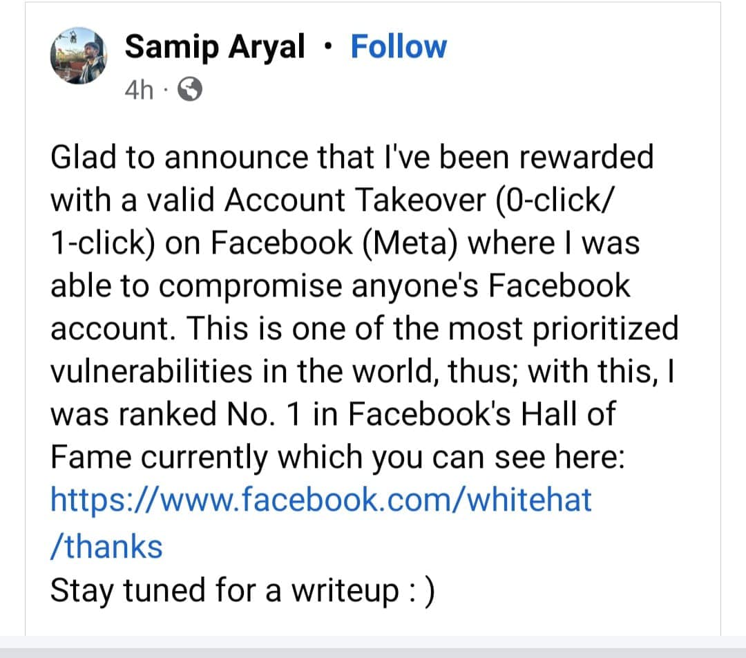 विश्वको चर्चित सामाजिक सञ्जाल फेसबुकको मातृ संस्था मेटाले नेपाली युवक समीप अर्याललाई आफ्नो सुरक्षा कमजोरी पत्ता लगाउने साइबर सुरक्षा विज्ञको पहिलो नम्बरमा राखेको छ । एक क्लिकमै जुनसुकैको अकाउन्ट ह्याक हुने कमजोरी फेला पारेपछि मेटाले नेपालका साइबर सुरक्षा अनुसन्धानकर्ता अर्याललाई पहिलो ¥याङ्कमा राखेको हो ।