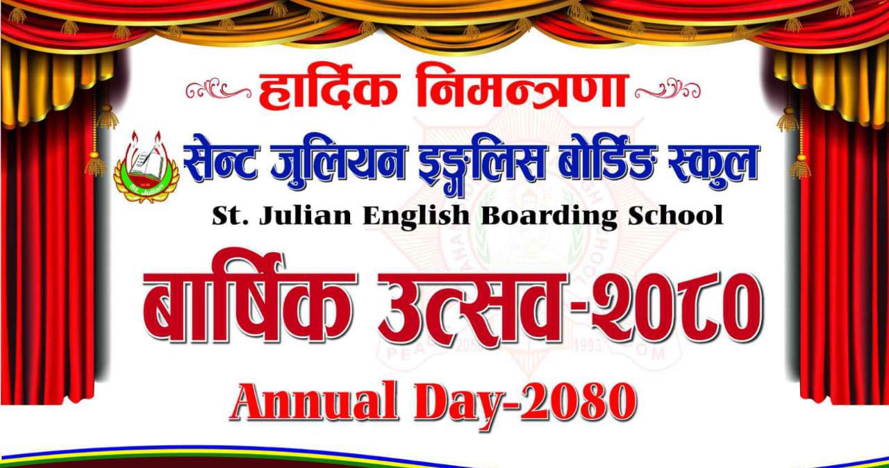 काठमाडौंको चावहिलमा अवस्थित सेन्ट जुलियन इङ्लिस बोर्डिङ स्कुलले आफ्नो स्थापनाको १५ औं वार्षिक उत्सव भव्यताका साथ सम्पन्न गरेको छ । शनिबार चावहिलस्थित एक पार्टी प्यालेसमा ९ सयभन्दा बढी अभिभावकहरुको उपस्थितिमा विद्यालयले वार्षिक उत्सव मनाएको हो ।