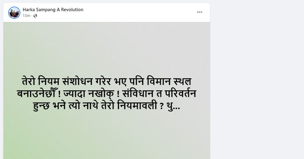 तर विमानस्थल धरानका जनताको माग हो । यो माग कुनै हालतमा सम्बोधन गरिनुपर्छ भनेका थिए । सोही वमोजिम नै कार्यदल बनेको थियो । अब कार्यदलको प्रतिवेदनले उनीहरुको योजनालाई गलत ठहराईदिएको छ । यद्यपि प्रतिवेदन सार्वजनिक भएपछि पनि मेयर हर्कले अभ्रद किसिमको टिप्पणी गरेका छन् , उनले सामाजिक संजालमा लेखेका छन्, तेरो नियम संशोधन गरेर भए पनि विमानस्थल बनाउनेछौँ ! ज्यादा नखोक् ! संविधान त परिवर्तन हुन्छ भने त्यो नाथे तेरो नियमावली ? थु… ।
