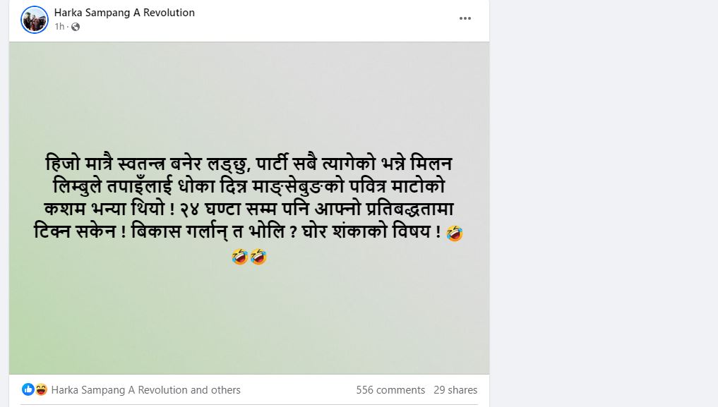 यस्तै मिलन लक्षित उनको अर्काे स्टाटस छ, हिजो मात्रै स्वतन्त्र बनेर लड्छु, पार्टी सबै त्यागेको भन्ने मिलन लिम्बुले तपाइँलाई धोका दिन्न माङ्सेबुङको पवित्र माटोको कशम भन्या थियो ! २४ घण्टा सम्म पनि आफ्नो प्रतिबद्धतामा टिक्न सकेन ! बिकास गर्लान् त भोलि ? घोर शंकाको विषय ! पहिचानवादीका रूपमा चिनिएका मिलन भने जनजाति पत्रकार महासंघ (फोनिज) का महासचिवसमेत हुन् ।
