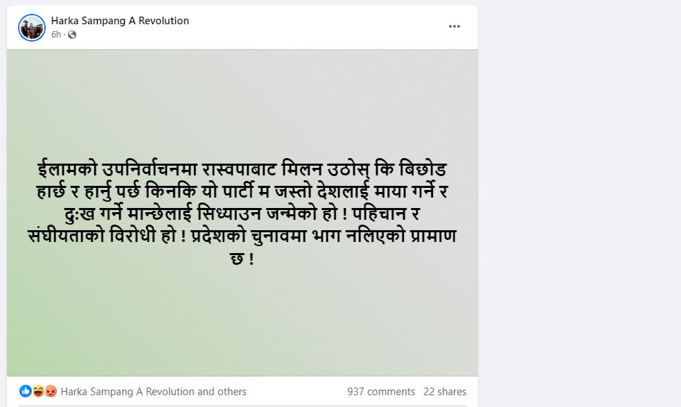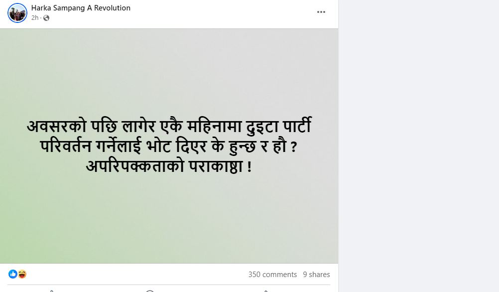 यसैलाई लक्षित गर्दै उनले लेखेका छन्, इलामको उपनिर्वाचनमा रास्वपाबाट मिलन उठोस् कि बिछोड हार्छ र हार्नु पर्छ किनकि यो पार्टी म जस्तो देशलाई माया गर्ने र दुःख गर्ने मान्छेलाई सिध्याउन जन्मेको हो ! पहिचान र संघीयताको विरोधी हो ! प्रदेशको चुनावमा भाग नलिएको प्रमाण छ ! यतिमा मात्रै हर्क रोकिएकाक छैनन् । उनले फेरि अर्काे स्टाटस लेखेका छन्, अवसरको पछि लागेर एकै महिनामा दुइटा पार्टी परिवर्तन गर्नेलाई भोट दिएर के हुन्छ र हौ ? अपरिपक्कताको पराकाष्ठा !