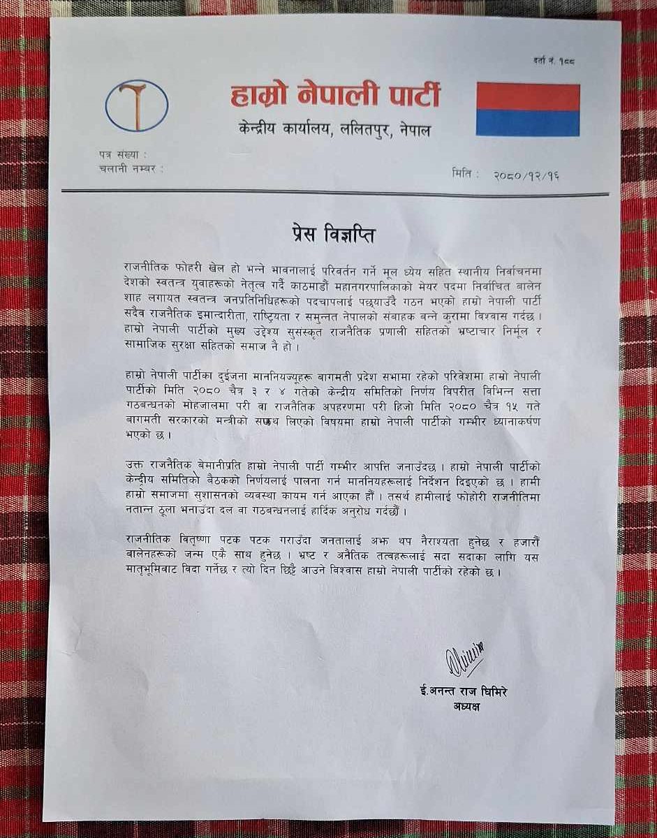 यता हाम्रो नेपाली पार्टी (हानेपा)ले बागमती प्रदेशको नवनियुक्त मन्त्री शैलेन्द्रमान बज्राचार्यलाई कारबाही गर्ने भएको छ । आज हेटौंडामा पत्रकार सम्मेलनको आयोजना गरि हानेपा केन्द्रीय अध्यक्ष अनन्तराज घिमिरेले पार्टी केन्द्रीय समितिको निर्णयविरुद्ध सपथ लिएका बज्राचार्यलाई कारबाही गर्ने बताए ।