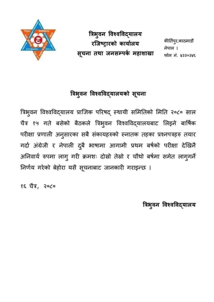 विश्वविद्यालयको सूचना तथा जनसम्पर्क महाशाखाका अनुसार स्नातक तह पहिलो वर्षको आउँदो परीक्षाबाटै प्रश्नपत्रमा अंग्रेजीका साथै नेपाली भाषामा पनि उल्लेख हुने निर्णय कार्यान्वय गरिनेछ । त्यसपछि दोस्रो, तेस्रो र चौथो वर्षको परीक्षाको प्रश्नपत्रमा लागु गरिनेछ । यसअघि प्रश्नपत्र अंग्रेजी भाषामा हुन्थ्यो ।