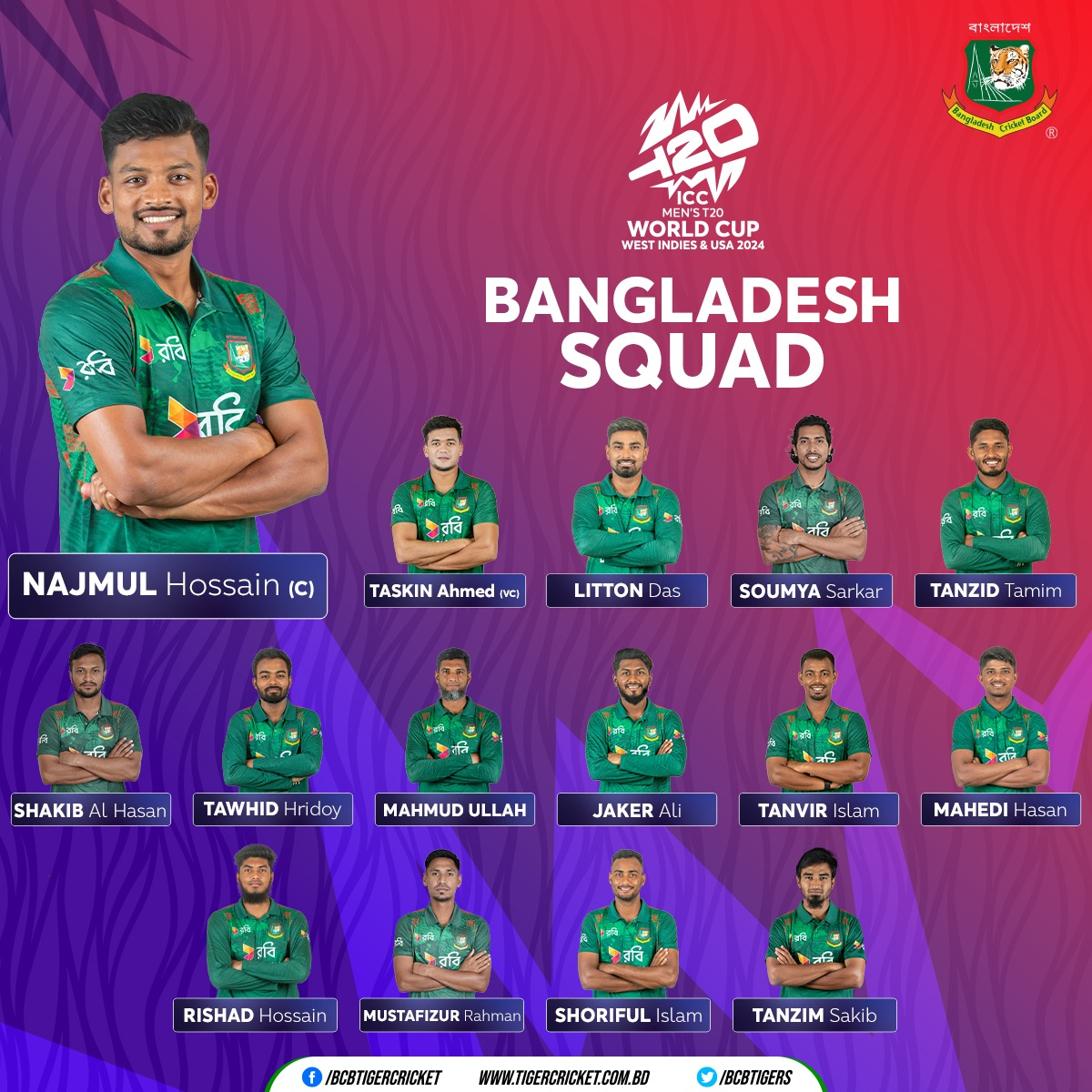 आईसीसी टी–२० विश्वकप क्रिकेटको नवौँ संस्करणका लागि बंगलादेशले आफ्नो टोलीको घोषणा गरेको छ । बंगलादेशले विश्वकपका लागि मंगलबार नजमुल हुसैन शान्तोको कप्तानीमा ढिलो गरी विश्वकप टोलीको घोषणा गरेको हो । आगामी टी–२० विश्वकप जुन १ देखि २९ तारिखसम्म अमेरिका र वेस्ट इन्डिजमा आयोजना हुँदैछ ।