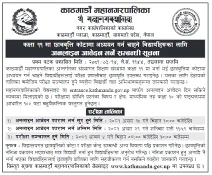 यस वर्ष पनि काठमाडौँ महानगरपालिकाले कक्षा ११ मा अध्ययन गर्ने विद्यार्थीलाई छात्रवृत्ति प्रदान गर्ने भएको छ। काठमाठौँ महानगरपालिकाले शुक्रबार सूचना जारी गर्दैै संस्थागत शिक्षण संस्था (निजी कलेज)मा कक्षा ११ मा छात्रवृत्ति कोटामा अध्ययन गर्न चाहने विद्यार्थीहरुका लागि अनलाइन आवेदन आह्वान गरेको हो।