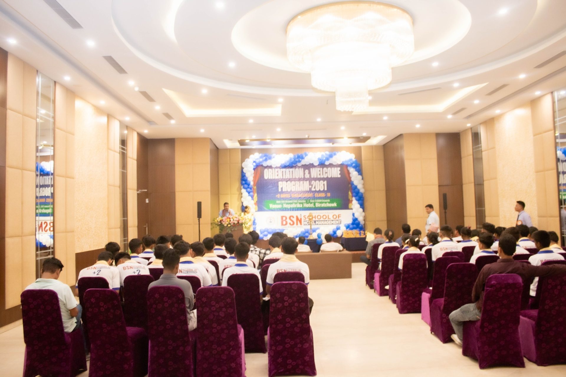 विराटनगरमा होटल म्यानेजमेन्ट मात्रै अध्ययन हुने एक मात्रै स्कुल बीएसएन स्कुल अफ होटल म्यानेजमेन्टले कक्षा ११ मा नयाँ भर्ना भएका विद्यार्थीहरुलाई स्वागत गरेको छ । नयाँ शैक्षिक सत्रका लागि स्कुलमा पहिलो ब्याचमा भर्ना भएका ५ दर्जन भन्दा बढी विद्यार्थीहरुलाई एक कार्यक्रममा बीच अभिमुखीकरण गरिएको छ ।