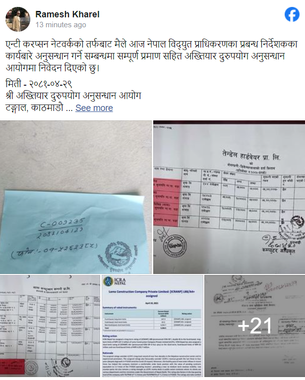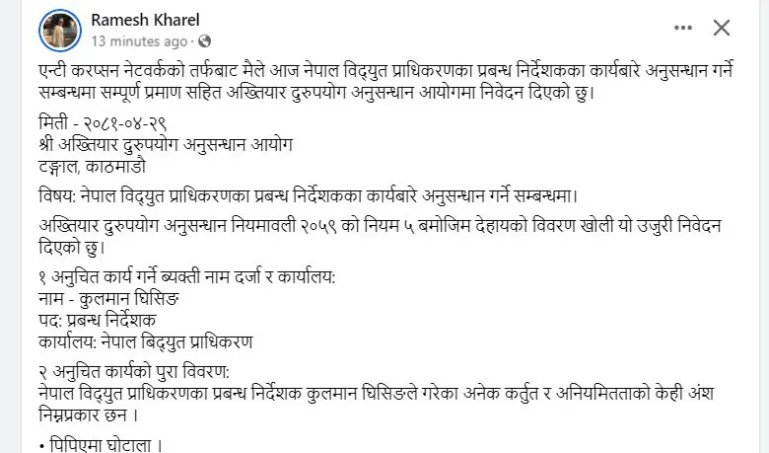 सामाजिक सञ्जाल फेसबुकमा लेख्दै खरेलले ‘एन्टिकरप्सन नेटवर्क’को तर्फबाट सम्पूर्ण प्रमाणसहित उजुरी दिएको जानकारी दिएका छन् ।