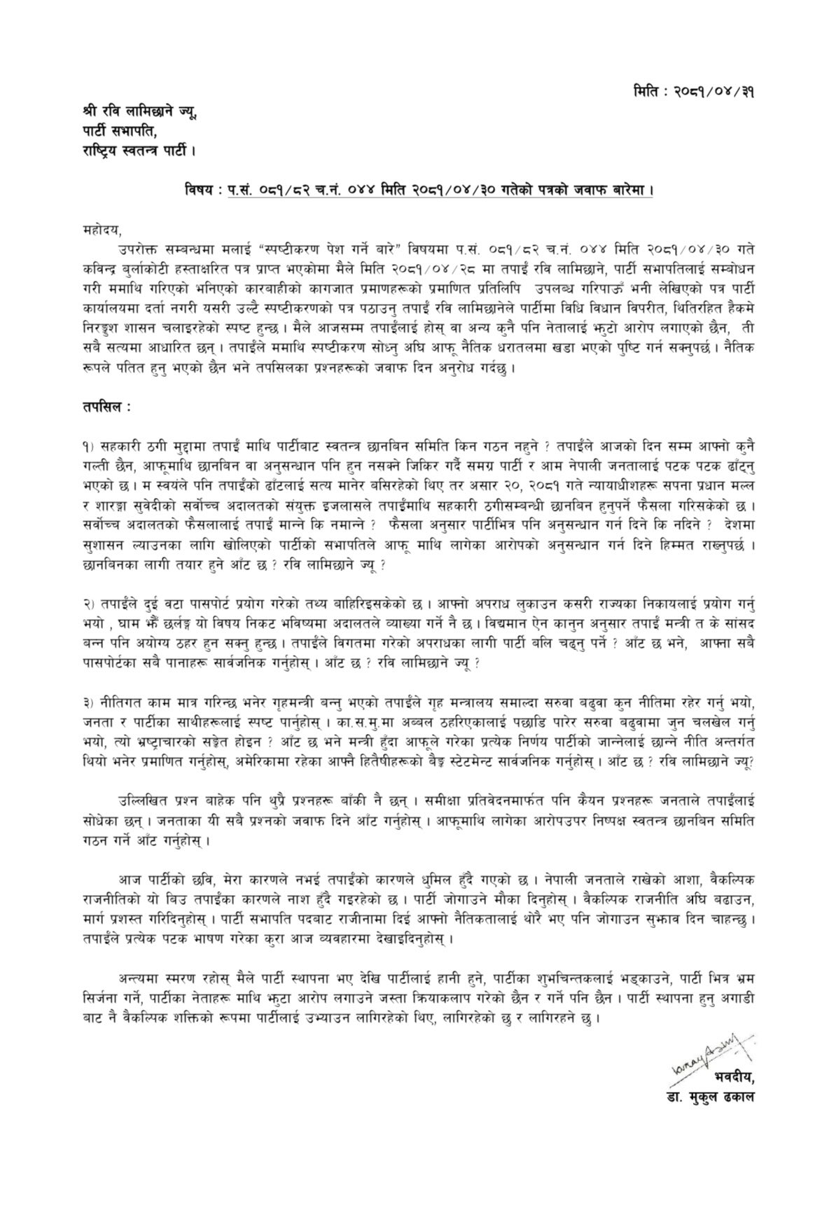 उनले स्पष्टीकरणमा लामिछानेमाथि सहकारी ठगी र दुई वटा पासपोर्ट प्रयोगबारे अनुसन्धान गर्नुपर्ने दोहोर्याउँदै लामिछानेले पार्टीमा विधि-विधानविपरीत, थीतिरहित हैकमे निरंकुश शासन चलाइरहेको दाबी गरेका हुन् ।