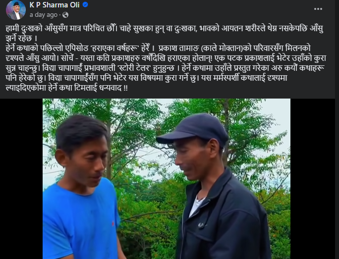 यसअघि पनि ओलीले प्रकाशको जीवनीका बारेमा भिडियो हेरेपछि उनले प्रकाश तामाङलाई भेट्ने चाहना प्रकट गरेका थिए । उनले लेखेका छन्, ‘हामी दुःखको आँशुसँग मात्र परिचित छौँ । चाहे सुखका हुन् वा दुःखका, भावको आयतन शरीरले थेग्न नसकेपछि आँशु झर्ने रहेछ। हेर्ने कथाको पछिल्लो एपिसोड हराएका वर्षहरू हेरेँ । प्रकाश तामाङ (काले मोक्तान)को परिवारसँग मिलनको दृश्यले आँशु आयो। ’ उनी अगाडि लेख्छन्, ‘यस्ता कति प्रकाशहरू वर्षौंदेखि हराएका होलान् । एक पटक प्रकाशलाई भेटेर उहाँको कुरा सुन्न चाहन्छु । विद्या चापागाईं प्रभावशाली स्टोरी टेलर हुनुहुन्छ । हेर्ने कथामा उहाँले प्रस्तुत गरेका अरू कयौँ कथाहरू पनि हेरेको छु । विद्या चापागाईंसँग पनि भेटेर यस विषयमा कुरा गर्ने छु । यो मर्मस्पर्शी कथालाई दृश्यमा ल्याइदिएकोमा हेर्ने कथा टिमलाई धन्यवाद ।