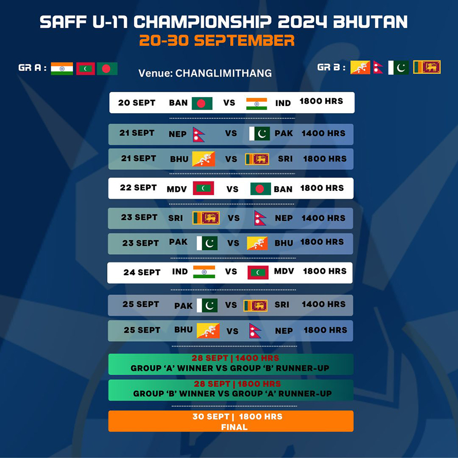 दुवै समूहको शीर्ष दुई स्थानमा रहने टोली सेमिफाइनल प्रवेश गर्नेछन् । फाइनल खेल सेप्टेम्बर ३० मा हुने छ । गत वर्ष भुटानमै भएको साफ यू-१७ च्याम्पियनसिपमा नेपाल समूह चरणबाटै बाहिरिएको थियो ।
