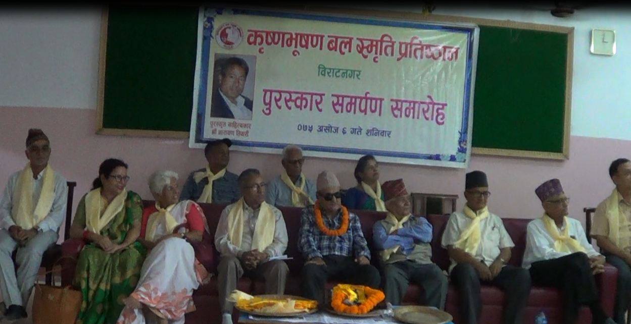 कृष्णभूषण बल स्मृति प्रतिष्ठानले कथाकार नारायण तिवारीलाई ‘कृष्णभूषण बल स्मृति साहित्य पुरस्कार समर्पण गरेको छ ।