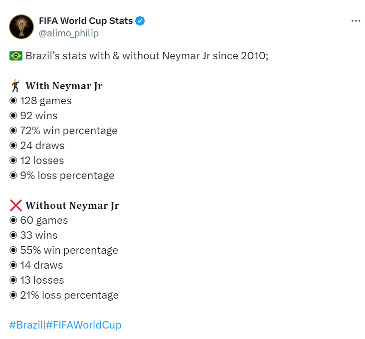यसरी ब्राजिलले जितका लागि संघर्ष गरिरहँदा स्टार खेलाडी नेयमारको चरम अभाव खड्किएको ब्राजिलका समर्थकहरूको आँकलन छ । सन् २०१० मा नेयमारले डेब्यु गरेयता उनी हुँदा र नहुँदा कति फरक पर्छ ? तथ्यांकका अनुसार नेयमार टोलीमा रहँदा ब्राजिलको जित धेरै रहेको छ ।
