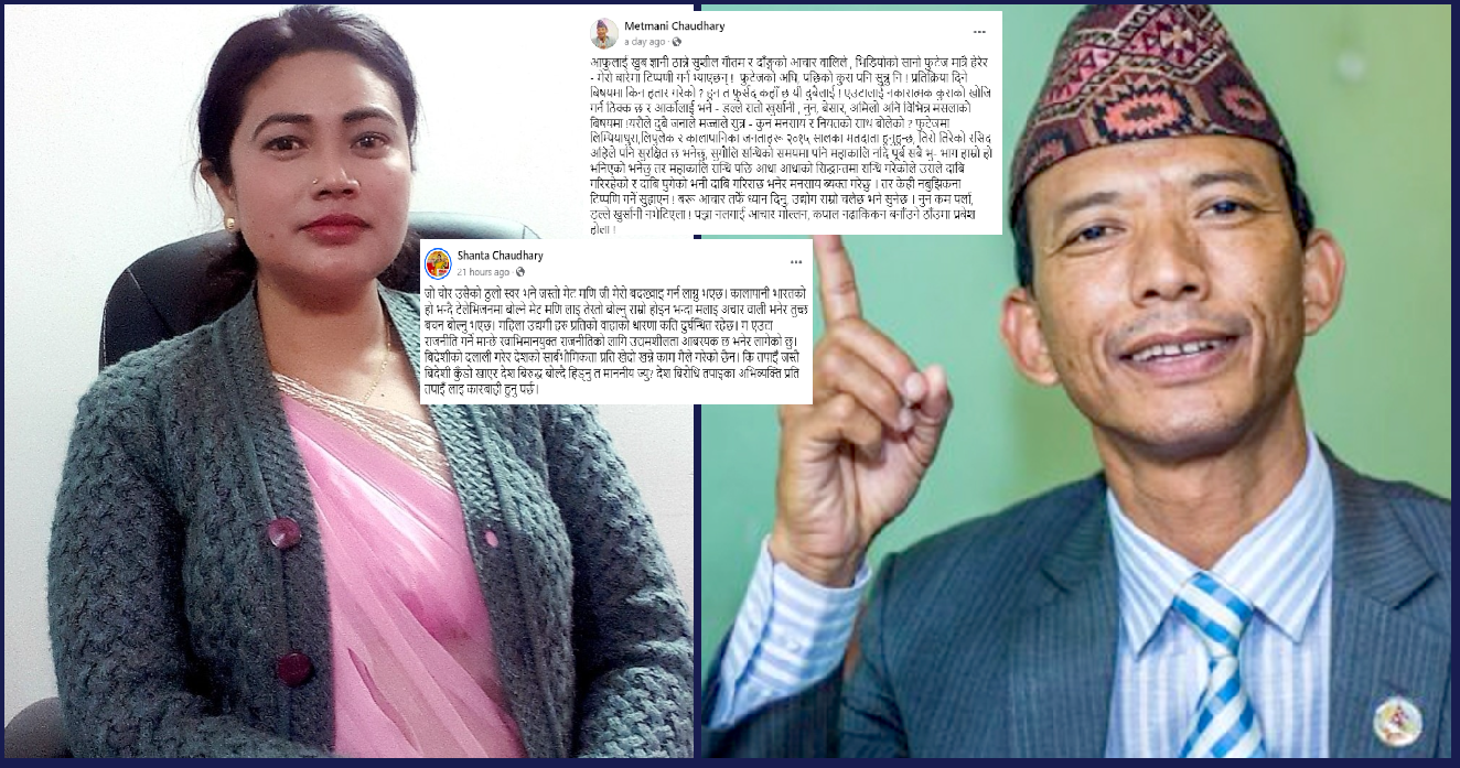 नेकपा एमालेकी पोलिटब्युरो सदस्य शान्ता चौधरी र नेकपा एकीकृत समाजवादीका उपमहासचिव मेटमणि चौधरीबीच सामाजिक सञ्जाल फेसबुकमा दोहोरी चलेको छ । दुई चौधरीबीच मेटमणिले दिएको विवादित अभिव्यक्तिलाई लिएर फेसबुकमा भनाभन चलेको हो ।