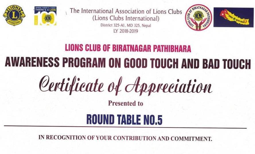 समाजमा ब्याप्त बिकृती विसंगति अन्त्यकालागि लायन्स क्लव अफ विराटनगर पाथिभराले श्री आधारभुत विद्यालय कञ्चवारीमा गुड टच र ब्याड टचका विषयमा जानकारी गराएको छ ।