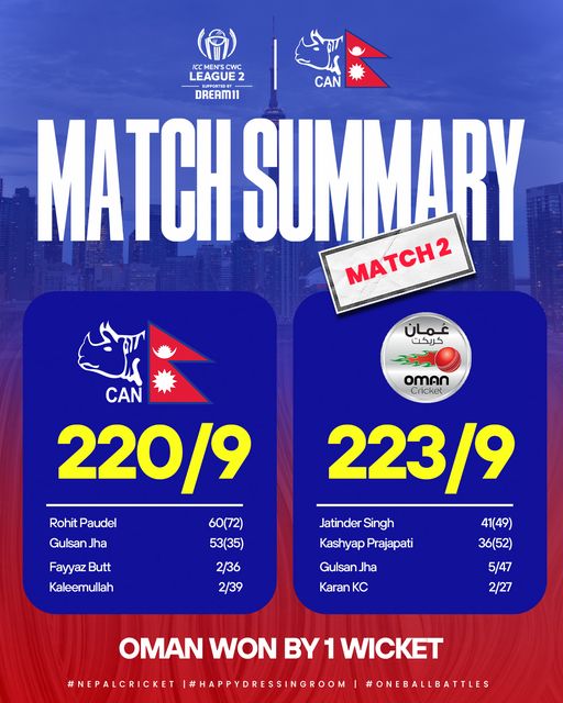 बुधबार राति क्यानडाको किङ सिटीमा भएको खेलमा नेपालले प्रस्तुत गरेको २२१ रनको लक्ष्य ओमानले ४९.५ ओभरमा नौ विकेट गुमाएर भेट्टायो । अन्तिमसम्म रोमाञ्चक बनेको खेलमा ओमानलाई जितका लागि अन्तिम ओभरमा आठ रनको आवश्यकता थियो ।