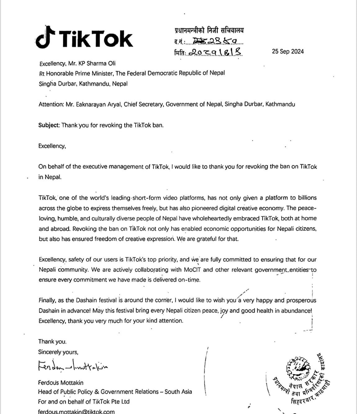 टिकटक साउथ एसियाले मुख्यसचिव एकनारायण अर्यालमार्फत् प्रधानमन्त्री ओलीलाई धन्यवाद नोट पठाएको टिकटकले एक विज्ञप्ति जारी गरेर जानकारी दिएको छ। टिकटकले अर्बौं मानिसहरूलाई स्वतन्त्रता अभिव्यक्त गर्न दिएको विज्ञप्तिमा उल्लेख छ।