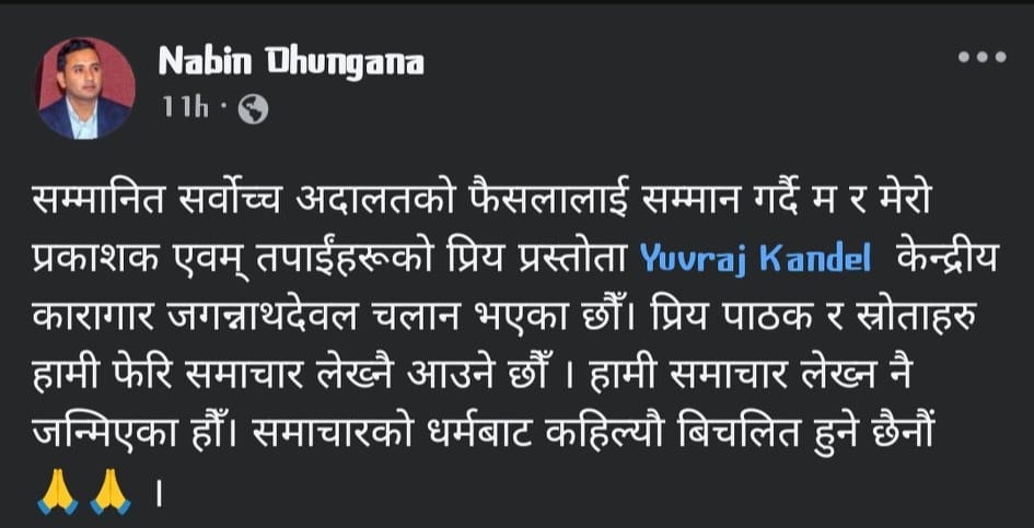 कारागार चलान भएपछि ढुंगानाले फेसबुकमा लेखेका छन्, ‘सम्मानित सर्वोच्च अदालतको फैसलालाई सम्मान गर्दै म र मेरो प्रकाशक एवम् तपाईंहरूको प्रिय प्रस्तोता युवराज कँडेल केन्द्रीय कारागार जगन्नाथदेवल चलान भएका छौँ। प्रिय पाठक र श्रोताहरू हामी फेरि समाचार लेख्न आउनेछौँ। हामी समाचार लेख्न नै जन्मिएका हौँ। समाचारको धर्मबाट कहिल्यौ विचलित हुने छैनौँ।’