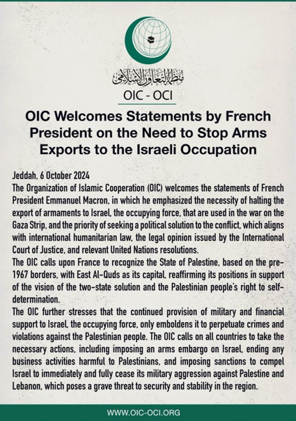 ओआईसीले फ्रान्सलाई दुई राज्य समाधानको समर्थन गर्न र प्यालेस्टिनी जनताको आत्मनिर्णयको अधिकारमा आफ्नो अडान दोहोर्याउन अपील गरेको छ। फ्रान्ससँगै ओआईसीले विश्वका अन्य देशहरूलाई पनि मध्यपूर्वको अवस्था सुधार्न इजरायललाई दिँदै आएको सैन्य र आर्थिक सहायता रोक्न आग्रह गरेको छ ।