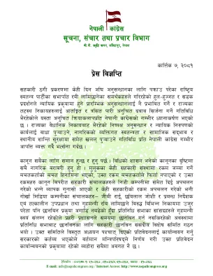 ‘सबै पक्षको सकारात्मक सहयोगबाट नै अनुसन्धानको प्रक्रियालाई प्रभावकारी बनाई दोषी नउम्कने र निर्दोष कोही पनि नफस्ने कुराको सुनिश्चिता गर्न सकिन्छ’, विज्ञप्तिमा भनिएको छ । राष्ट्र सेवकलाई कानुन बमोजिम तोकिएको काम गर्न नदिन वा कर्तव्य पालन गर्न नदिने हिसाबले पाँच जनाभन्दा बढी भेला गर्नु गराउने आफैंमा कसुर भएको बताएको छ ।