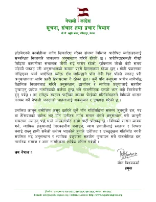 कांग्रेसले न्यायिक प्रक्रियालाई विश्वसनीय बनाउन र विधिको शासन कायम गर्न उत्तेजित र उच्छृङ्खल गतिविधि नगरी संयमित रहन सबै पक्षलाई अपिल गरेको छ । यसअघि बुधबार बसेको सत्तारुढ दलहरूको बैठकले लामिछाने पक्राउ परेपछि सडकमा भिड जम्मा गरेर छानबिन प्रभावित पार्न खोजेको निष्कर्ष निकालेका थिए ।