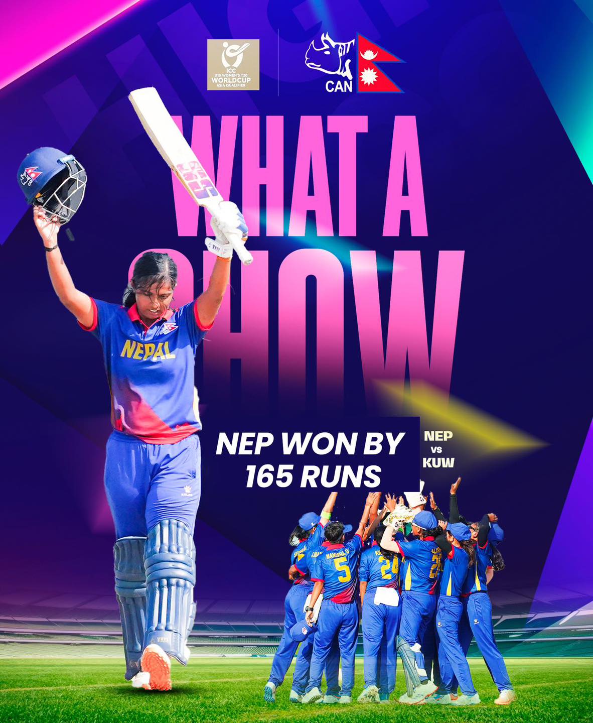 बलिङ र ब्याटिङ दुवैतर्फ कप्तान पूजा महतोले उत्कृष्ट प्रदर्शन गरेपछि नेपाली यू–१९ महिला क्रिकेट टिमले आईसीसी यू–१९ महिला ट्वान्टी–२० विश्वकपको एसिया छनोटमा कुवेतविरुद्ध १६५ रनको फराकिलो जित निकालेको छ ।