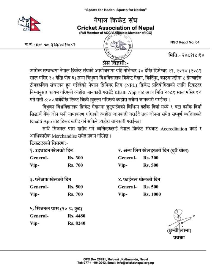 नेपाल क्रिकेट संघ (क्यान)ले सिद्धार्थ बैंक नेपाल प्रिमियर लिग (एनपिएल) का लागि टिकट बिक्री खुला गरेको छ। गएरातिदेखि खुला गरिएको टिकट खल्ती एपबाट काट्न सकिनेछ। क्यानले सोमबार उद्घाटन खेल, लिग, प्लेअफ खेल, फाइनल र सिजनल पासको टिकटसमेत निर्धारण गरेको हो।
