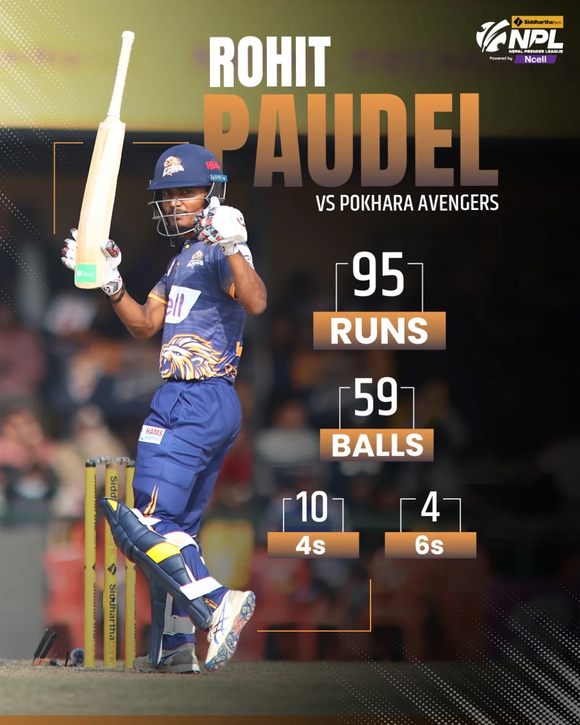 यस्तै, सन्दीप जोराले १८ रन बनाए । पोखरा एभेन्जर्सका लागि विपिन खत्रीले २ तथा म्याट क्रिचलेले १ विकेट लिए ।अन्तिम बलमा रन आउट भएका रोहितले ५९ बलमा १० चौका र ४ छक्का प्रहार गरे। जारी एनपिएलमा यो स्कोर व्यक्तिगत उच्च स्कोर हो।