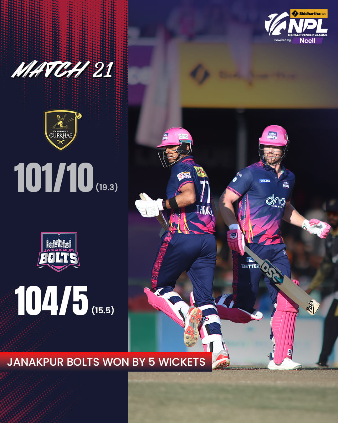 नेपाल प्रिमियर लिग(एनपिएल)मा काठमाडौं गुर्खाजलाई पराजित गर्दै जनकपुर बोल्ट्स प्लेअफमा पुगेको छ । बिहीवारको दोस्रो खेलमा काठमाडौंमाथि ५ विकेटको जितका साथ जनकपुर प्लेअफमा स्थान पक्का गर्ने पहिलो टोली बनेको छ ।