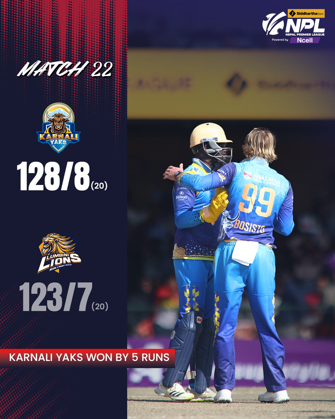 रोहित पौडेल, सादबीन जफर र रामोन सिम्मोन्डस्ले १–१ विकेट लिए । आजको जितसँगै कर्णाली ८ अंकसहित तालिकाको तेस्रो स्थानमा छ । लुम्बिनी भने २ अंकसहित प्रतियोगिताबाट बाहिरिएको छ ।