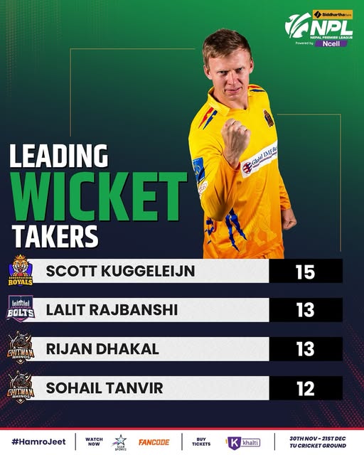 सर्वाधिक विकेट लिने खेलाडीमा सुदूरपश्चिम रोयल्सबाट खेलिरहेका न्युजिल्यान्डका स्कट कुगलाइन अगाडि छन्। उनले ७ खेलमा १५ विकेट लिएका छन् । पोखराविरुद्धको खेलमा मात्रै उनले एक्लै ५ विकेट लिएर टिमलाई रोमाञ्चक जित दिलाएका थिए।