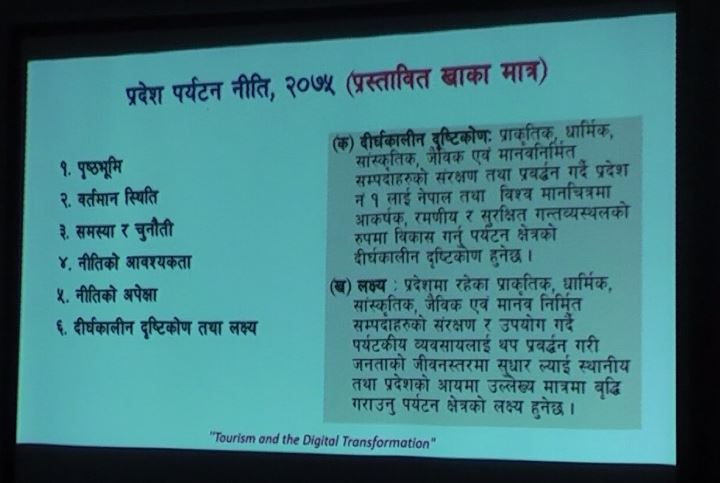 कार्यक्रममा उद्योग,पर्यटन,वन तथा वातावरण मन्त्रालय प्रदेश १ का सचिव बद्रीराज ढुंगानाले पर्यटन प्रवद्र्धनका लागि निजी क्षेत्रहरुमा साझेदारी जरुरी रहेको बताए । उनले एकेडेमिक क्षेत्रमा पनि पर्यटन ब्यबसाय समावेश गर्नुपर्ने बताउँदै सर्वप्रथम छिमेकी मुलुकका पर्यटनहरुलाई आकर्षित गर्नुपर्नेमा जोड दिए ।