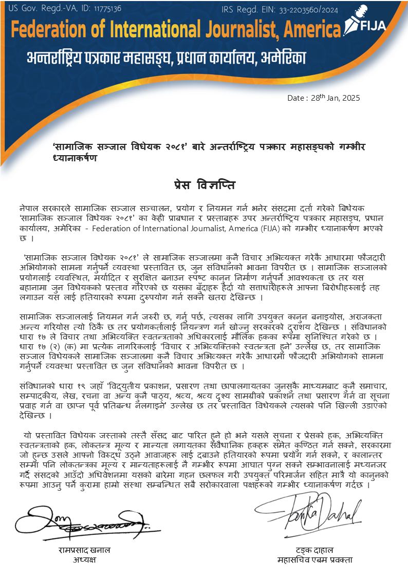 एक विज्ञप्ति जारी गर्दै अन्तराष्ट्रिय पत्रकार महासंघले यो विधेयक जस्ताको तस्तै संसदबाट पारित भए सूचना र प्रेसको हक र स्वतन्त्र अभिब्यक्तिको स्वतन्त्रता कुन्ठित गर्ने, सरकारले आफूविरुद्ध आवाज दबाउन हतियारको रुपमा प्रयोग गर्ने भएकाले गहन छलफल गरी परिमार्जन गर्न माग गरेको छ।
