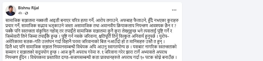 बुधबार फेसबुकमा लेख्दै रिजालले सामाजिक सञ्जालमा नक्कली आइडी बनाएर चरित्र हत्या गर्ने, आरोप लगाउने र अफवाह फैलाउने जस्ता गतिविधि नियन्त्रण गर्न आवश्यक रहेको औंल्याएका छन् ।