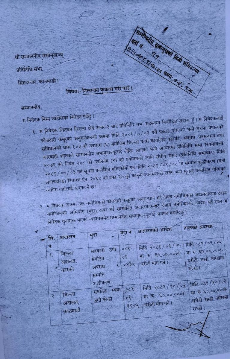 लामिछानेले दिएको निवेदनमा अदालतले पुर्पक्षमा थुनामा पठाउने निर्णय गरेको खण्डमा मात्रै सांसद पदबाट निलम्बन हुनुपर्नेमा त्यस्तो नभएको उल्लेख छ । लामिछानेले भनेका छन्,‘सम्पत्ति शुद्धीकरण निवारण ऐन, २०६४ को दफा २७ बमोजिम मलाई गरिएको निवेदन कानुन सम्मत नभएको भन्दै आजकै बैठकबाट निलम्बन फुकुवा गरिदिनुस् ।’