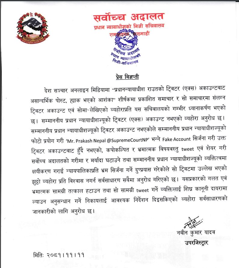 ‘फेक अकाउन्ट सिर्जना गरी उक्त ट्विटर अकाउन्टबाट हुँदै नभएको, कपोकल्पित र भ्रमात्मक विषयवस्तु ट्विट एवं शेयर गरी सर्वोच्च अदालतको गरीमा र मर्यादा घटाउने तथा सम्माननीय प्रधान न्यायाधीशज्यूको व्यक्तित्वमा क्षयीकरण गराई न्यायपालिकाप्रति भ्रम सिर्जना गर्ने दुष्प्रयास गरेकोले सो ट्विटमा उल्लेख भएको झुट्टो व्यहोरा प्रति विश्वास नगर्न सर्वसाधारण सबैमा अनुरोध गरिएको छ,’ विज्ञप्तिमा भनिएको छ।
