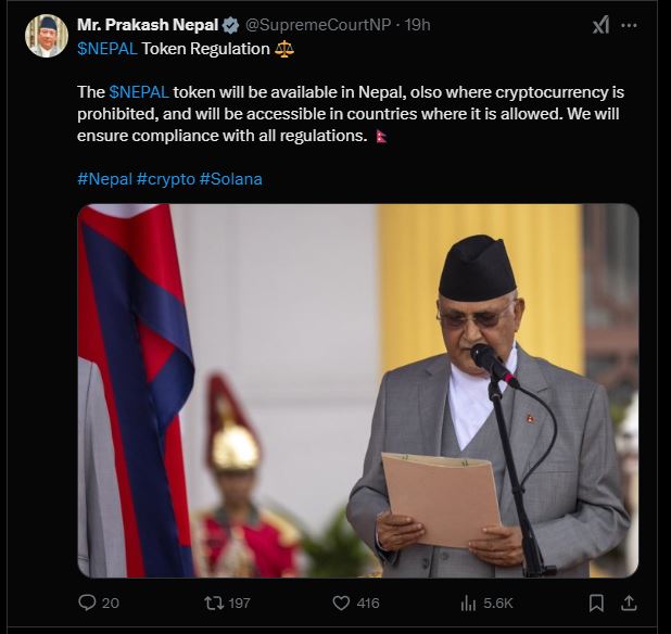 फेब्रुअरी २०२५ मा खोलिएको यो अकाउन्टको परिचय प्रधानन्यायाधीश प्रकाशमान सिंह राउतको नाम लेखेर राउतको तर्फबाट आधिकारीक जानकारी पोष्ट गरिने बताइएको छ । उक्त अकाउन्टको पीन पोस्टमा नेपालले फागुन १२ मा आधिकारीक रुपमा ‘डलर नेपाल, नेसनल क्वेन’ नामको ‘क्रिप्टो करेन्सी’सर्वाजनिक गर्न लागेको सूचना राखिएको छ ।