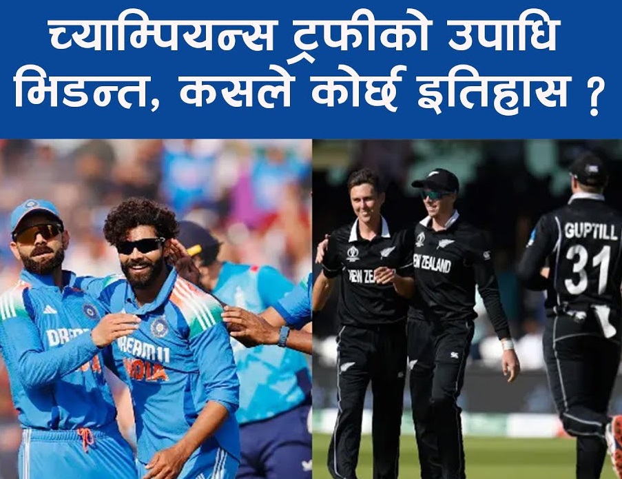 आइसिसी च्याम्पियन्स ट्रफी क्रिकेटको फाइनल आज हुँदैछ । उपाधिका लागि दुबईमा भारत र न्युजिल्याण्डबीच प्रतिस्पर्धा हुँदैछ । युएईको दुबई अन्तर्राष्ट्रिय क्रिकेट स्टेडियममा नेपाली समय अनुसार खेल दिउँसो २ः४५ बजे सुरु हुनेछ ।