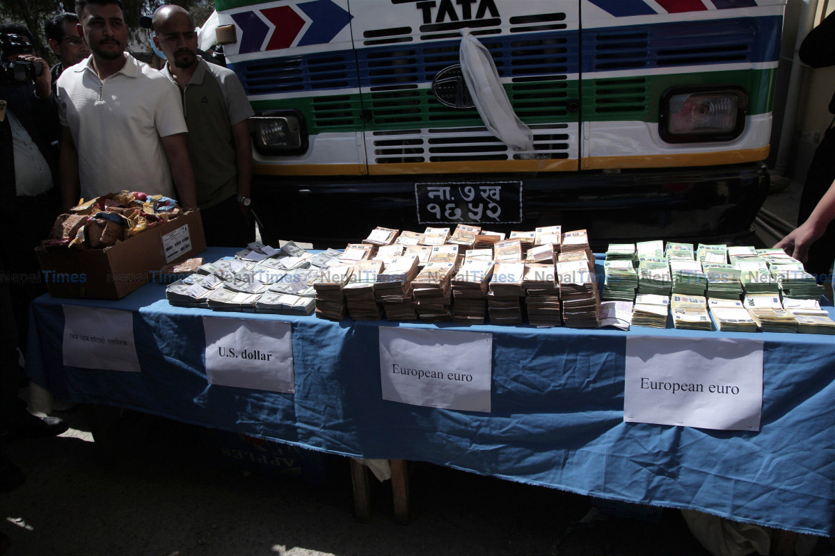 र उनले आफू ट्रक लिएर कपडा किन्न चीन जान लागेको बताएका थिए । तर विदेशी भारी रकमसहित उनी टोखा झोरमा पक्राउ परे । प्रहरीले ट्रकबाट अमेरिकी डलर सय दरका तीन हजार ११९ थान तथा युरो पाँच सय दरका ११, दुई सय दरका ४८०, सय दरका चार हजार १४८ र ५० दरका १७ हजार १७७ थान बरामद गरेको छ ।