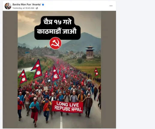 माओवादीका उपमहासचिव वर्षमान पुन अन्नतले एआईबाट बनाइएको फोटोमार्फत लङ लाइभ रिपब्लिक नेपालको ब्यानरसहित चैत १५को प्रर्दशनमा सहभागि हुन् सामाजिक संजालमार्फत आह्वान गरेका छन् । जसमा अधिकांशका प्रतिक्रियाहरु नकारात्मक आएका छन् । जहाँबाट केही प्रतिनिधि प्रतिक्रियाहरु मात्रै हामीले यहाँ प्रस्तुत गरेका छौं ।