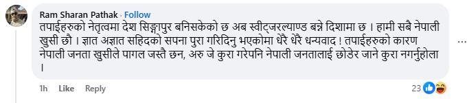 तपाईहरुको नेतृत्वमा देश सिङ्गापुर बनिसकेको छ अब स्वीट्जरल्याण्ड बन्ने दिशामा छ । हामी सबै नेपाली खुसी छौ । ज्ञात अज्ञात सहिदको सपना पुरा गरिदिनु भएकोमा धेरै धेरै धन्यवाद ! तपाईहरुको कारण नेपाली जनता खुसीले पागल जस्तै छन, अरु जे कुरा गरेपनि नेपाली जनतालाई छोडेर जाने कुरा नगर्नुहोला ।