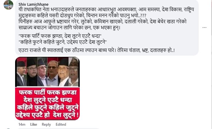 यी तथाकथित नेता भनाउदाहरुले जनताहरुका आधारभुुत आवश्यक्ता, आम समस्या, देश विकास, राष्ट्रिय मुद्दाहरुमा कहिले यसरी दोडधुप गरेको, चिन्तन मनन गरेको पाउनु भयो..? यिनीहरु आज आफुले भ्रष्टाचार गरेर, लुटेको, कमिशन खाएको, दलाली गरेको, देश बेचेर खडा गरेको साम्राज्य बचाउन जोगाउन लागि परेका छन, एक भएका हुन्।“फरक पार्टी फरक झण्डा, देश लुटने एउटै धन्दा“
