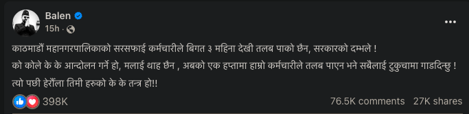 ‘काठमाडौं महानगरपालिकाको सरसफाई कर्मचारीले विगत ३ महिनादेखि तलब पाको छैन, सरकारको दम्भले,’ उनले फेसबुकमा लेखेका छन्, ‘को कोले के के आन्दोलन गर्ने हो, मलाई थाह छैन, अबको एक हप्तामा हाम्रो कर्मचारीले तलब पाएन भने सबैलाई टुकुचामा गाडदिन्छु !’ उनले लेखेका छन्, ‘त्यो पछि हेरौंला तिमीहरूको के के तन्त्र हो !